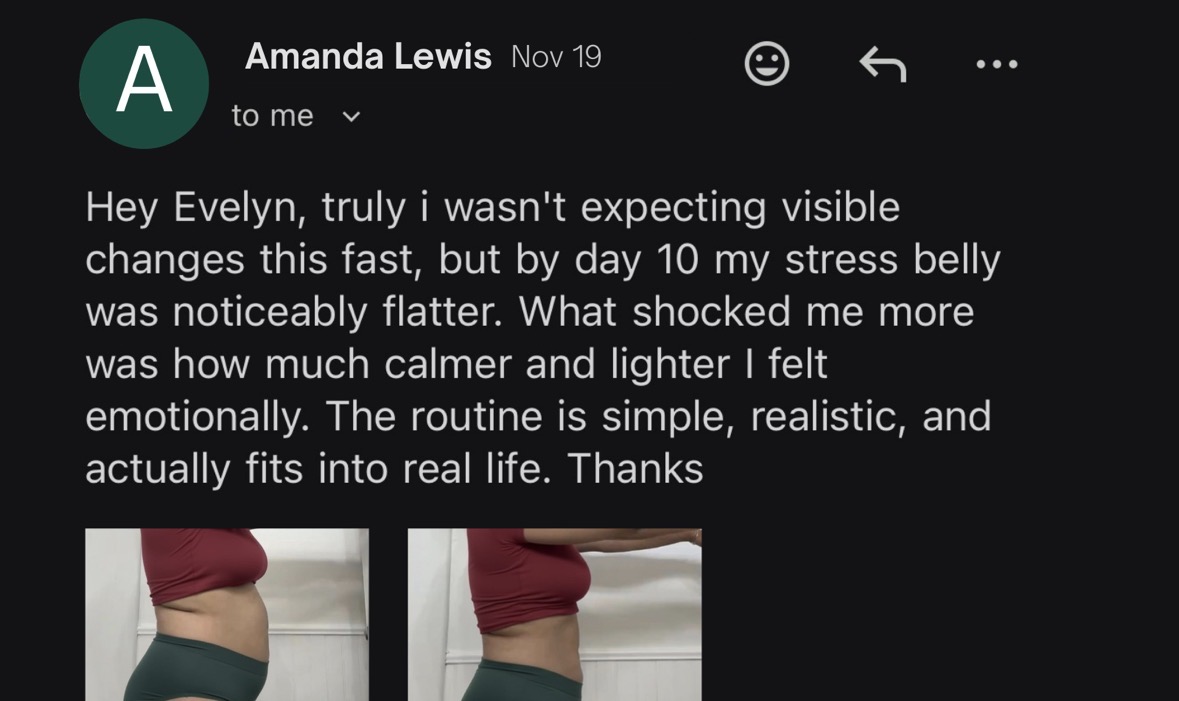 Most women feel a shift in sleep and nervous system (less wired, calmer) within 3–7 days. Belly, skin, and energy changes usually become obvious by the end of the 14 days.